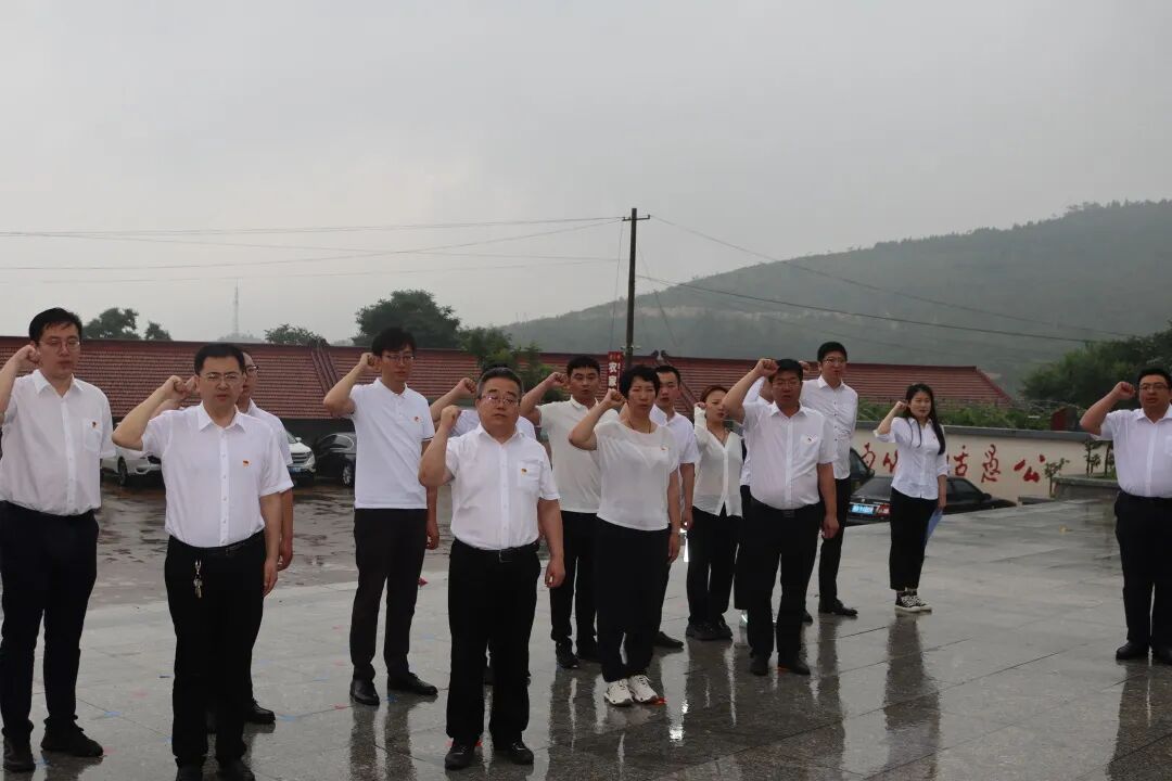 在周恩来总理像前,全体党员干部面对党旗庄严举起右手,重温入党誓词。